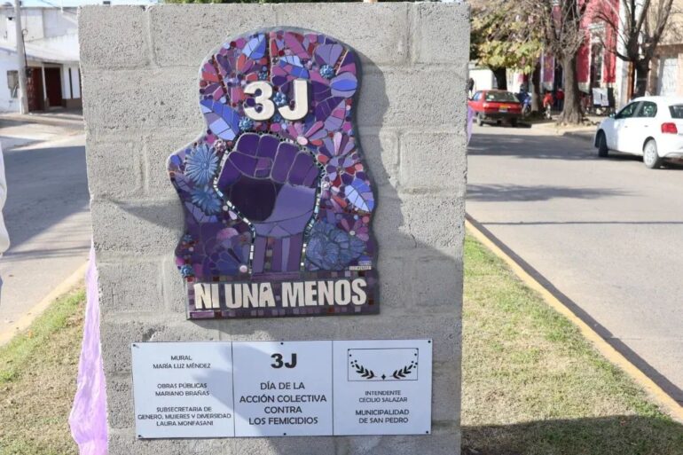 En el marco del décimo aniversario del primer grito colectivo de Ni Una Menos, la Municipalidad de San Pedro, a través de la Subsecretaría de Políticas de Género, Mujeres y Diversidad, realizó este martes 3 de junio un acto en la intersección de las calles 3 de Febrero y Sarmiento, donde quedó inaugurado un mural conmemorativo.