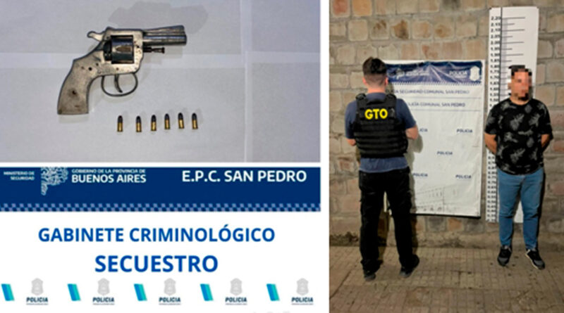 En la tarde de ayer, personal del Gabinete Criminológico de la Estación Comunal de Policía de San Pedro realizó un allanamiento en una vivienda de calle Ruffa al 1000, autorizado por el Juzgado de Garantías de San Nicolás, en el marco de una causa por amenazas agravadas. Durante el procedimiento, fue aprehendido un hombre de 38 años y se le secuestró un revólver calibre 22 con seis cartuchos intactos.