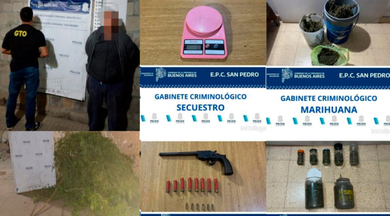 Durante el procedimiento, los efectivos secuestraron un pistolón calibre 12, cartuchos de distintos calibres, una balanza de precisión, 7 frascos con marihuana, 2 baldes con la misma sustancia y 2 plantas de gran tamaño, arrojando un pesaje total de 3,350 kilos. El morador, un hombre de 34 años, fue aprehendido y trasladado a la dependencia policial, imputado por tenencia ilegal de arma de fuego de uso civil y tenencia ilegal de estupefacientes para consumo personal, quedando a disposición de la UFI N°11 de San Pedro.