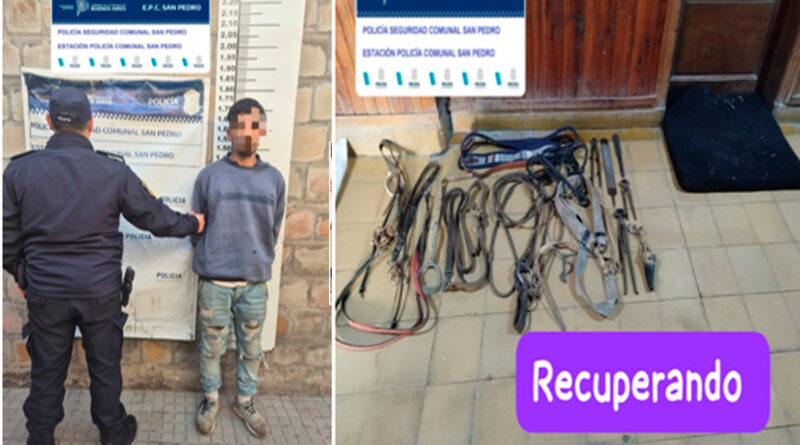 Un hombre de 28 años, con antecedentes delictivos, fue aprehendido en la vía pública en inmediaciones de La Valle y Benefactora Sampedrina, tras un llamado al 911 que alertó sobre un robo en una vivienda cuyos moradores se encontraban ausentes. El operativo, realizado durante la mañana de ayer por personal de la Estación de Policía Comunal, permitió interceptar al sospechoso cuando huía portando una bolsa tipo arpillera que contenía riendas, elementos de destreza gaucha, herramientas de mano y un cojinillo, objetos que habían sido sustraídos instantes antes.