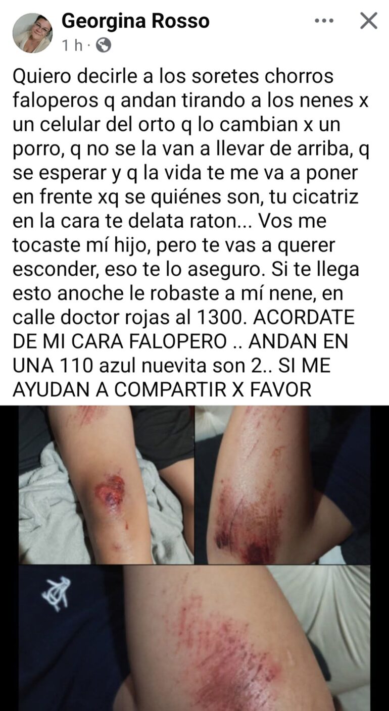 > “Quiero decirle a los soretes chorros faloperos q andan tirando a los nenes x un celular del orto q lo cambian x un porro, q no se la van a llevar de arriba, q se esperar y q la vida te me va a poner en frente xq se quiénes son, tu cicatriz en la cara te delata raton… Vos me tocaste mí hijo, pero te vas a querer esconder, eso te lo aseguro. Si te llega esto anoche le robaste a mí nene, en calle doctor rojas al 1300. ACORDATE DE MI CARA FALOPERO .. ANDAN EN UNA 110 azul nuevita son 2.. SI ME AYUDAN A COMPARTIR X FAVOR”.