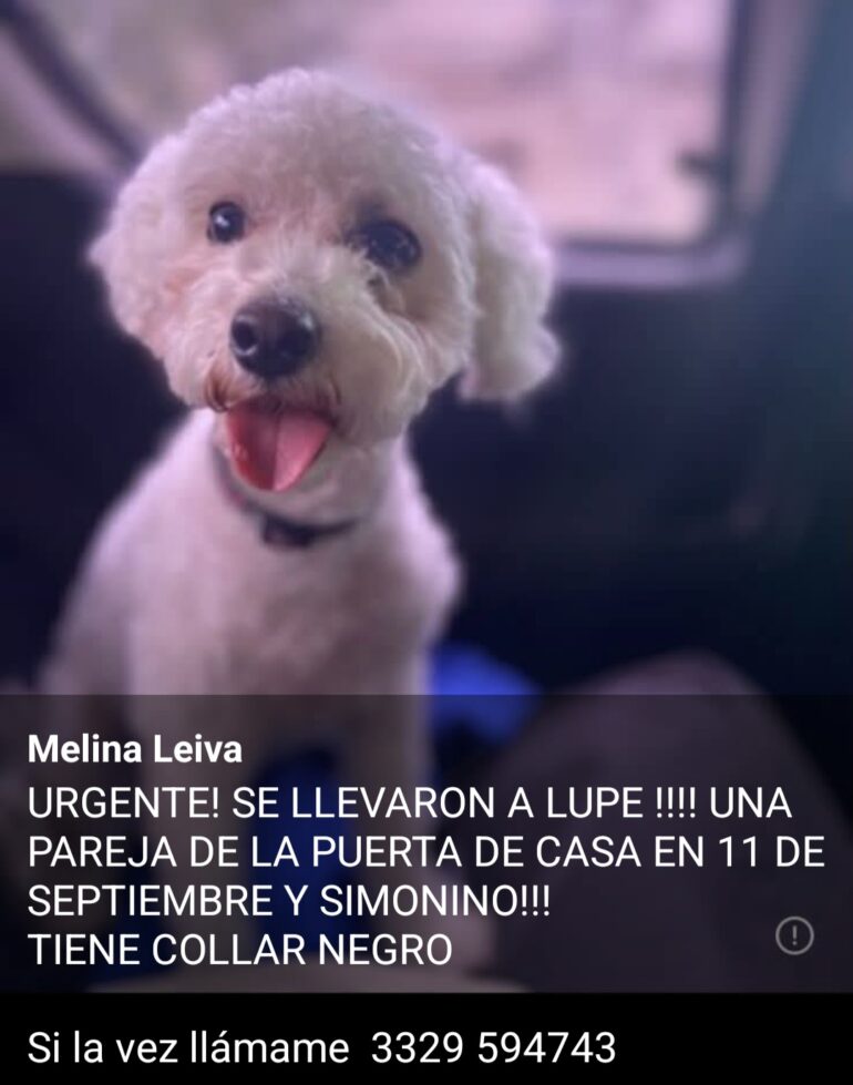 La publicación detalla que Lupe llevaba puesto un collar negro al momento del hecho. Ante cualquier información que pueda ayudar a dar con su paradero, se solicita comunicarse de inmediato al 3329 594743. La familia pide difusión para lograr que la mascota regrese a su hogar.