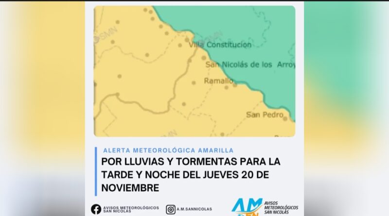 El Servicio Meteorológico Nacional emitió una alerta amarilla por lluvias y tormentas fuertes que afectarán la región durante la tarde y la noche del jueves 20 de noviembre. El aviso abarca a San Nicolás, Ramallo y San Pedro (Buenos Aires) y Villa Constitución (Santa Fe).