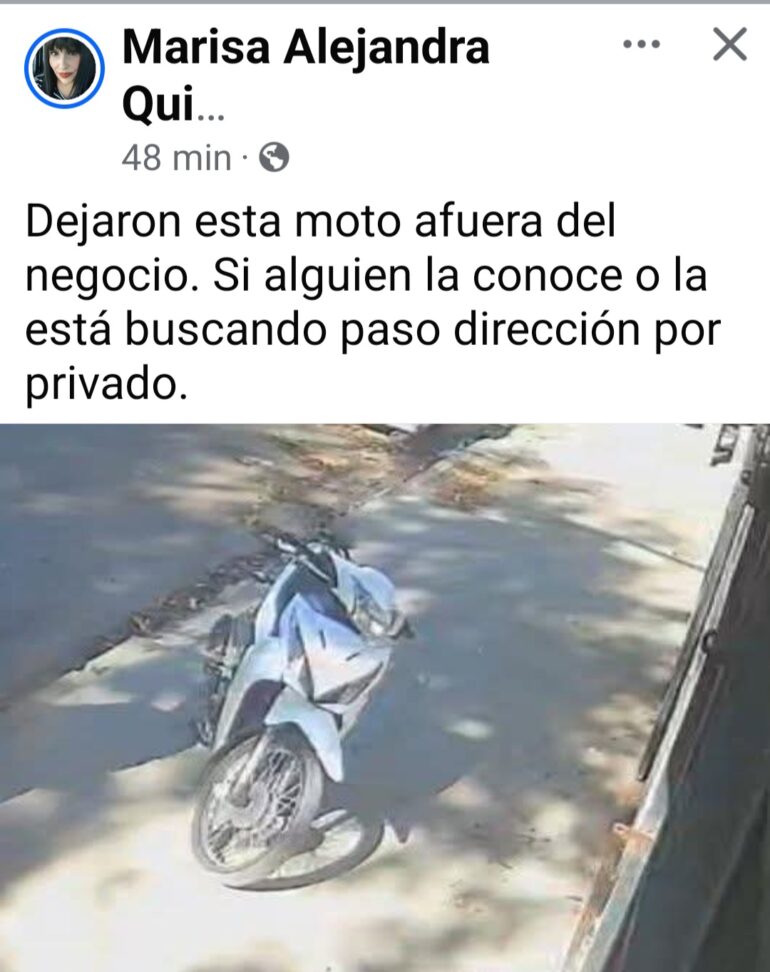 A través de su mensaje, la comerciante solicitó colaboración para dar con el propietario, indicando que brindará la dirección exacta de manera privada a quien pueda aportar información o esté buscando el vehículo. La situación generó curiosidad entre los vecinos y usuarios, ya que se desconoce cómo y por qué la moto fue abandonada en ese sitio.