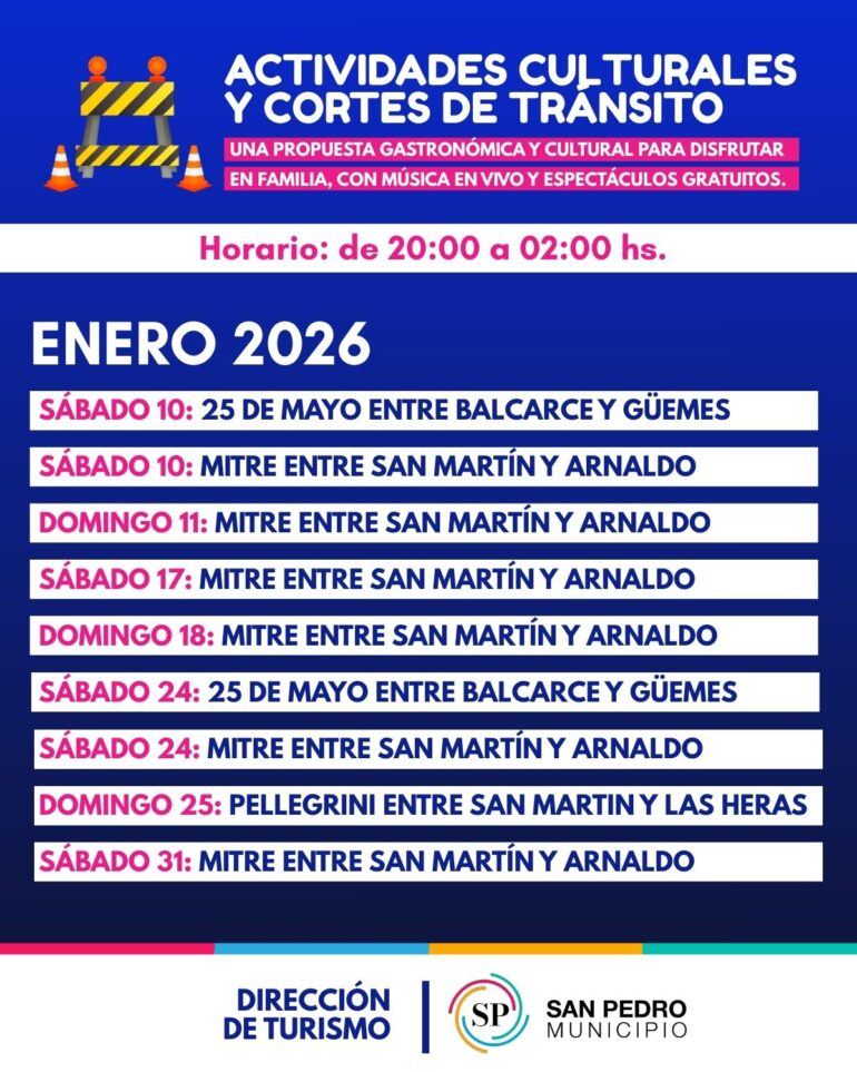 La Municipalidad de San Pedro informó que durante los próximos fines de semana se implementarán cortes de tránsito en distintos sectores del centro de la ciudad, debido al desarrollo de una propuesta gastronómica y cultural que incluirá música en vivo y espectáculos gratuitos, pensada para disfrutar en familia.