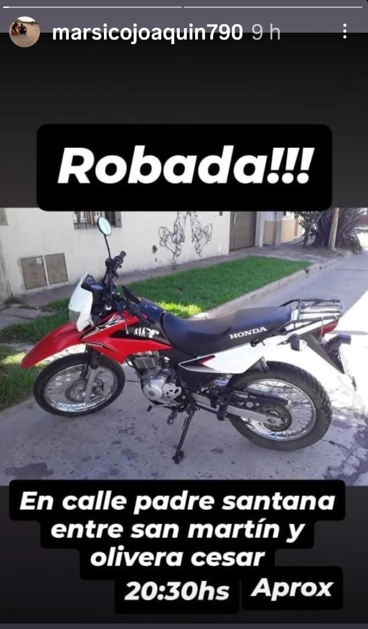 A través de publicaciones en redes sociales, vecinos alertaron sobre el robo de una motocicleta ocurrido durante la noche de este martes en inmediaciones de calle Padre Santana, entre San Martín y Olivera César. Según indicaron, el hecho se habría producido alrededor de las 20:30 horas.