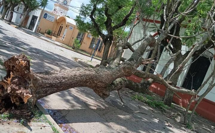 Este domingo, los intensos vientos que azotan la región provocaron la caída de un árbol en la calle 9 de Julio, entre Salta y Rivadavia. La situación generó preocupación en los vecinos debido a los posibles riesgos que representa para el tránsito en la zona.