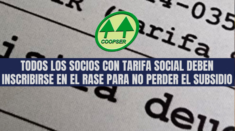 COOPSER recuerda a quienes reciben su factura de energía eléctrica en la categoría T1R (Tarifa Social) y aún no se han registrado en el RASE (Registro de Acceso a los Subsidios a la Energía) que deben hacerlo antes del 4 de septiembre para mantener el beneficio.