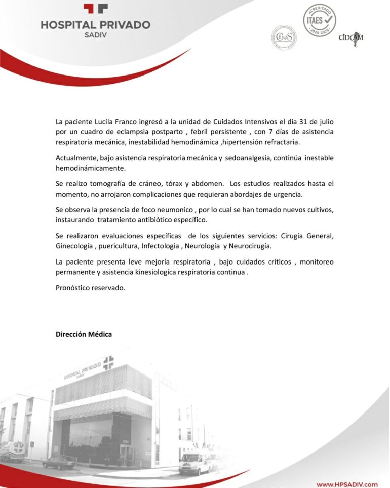 La joven Lucila Franco permanece internada en estado crítico y con pronóstico reservado en la Unidad de Terapia Intensiva del Hospital Privado SADIV, donde fue ingresada el pasado 31 de julio luego de sufrir una convulsión severa provocada por un pico de presión arterial, horas después de haber sido sometida a una cesárea. El diagnóstico médico confirmó un cuadro de eclampsia postparto, con fiebre persistente, inestabilidad hemodinámica e hipertensión refractaria, lo que obligó a su intubación y asistencia respiratoria mecánica.