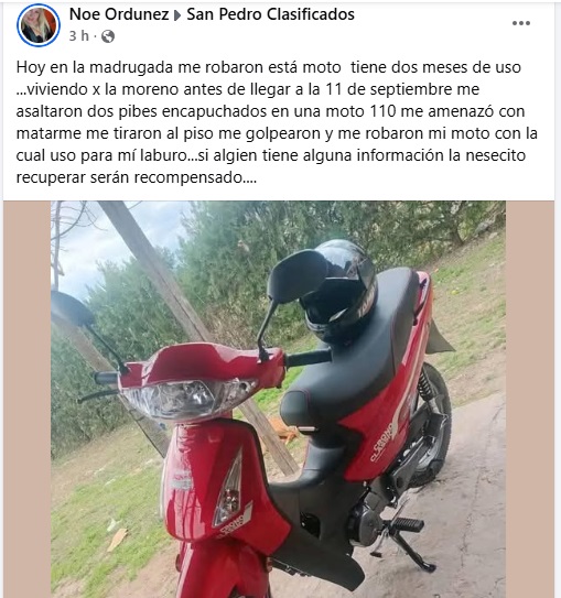 Un joven denunció en redes sociales que fue víctima de un violento asalto durante la madrugada de este lunes, cuando circulaba en su motocicleta por calle Moreno, antes de llegar a 11 de Septiembre.