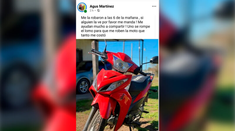 Una vecina difundió en redes sociales que le robaron la motocicleta durante la madrugada, alrededor de las 6 de la mañana, y pidió a la comunidad colaboración para encontrar el rodado y compartir la información. En su publicación la damnificada expresó el desgaste que le provocó perder la moto con la que trabaja y solicitó difusión entre vecinos y comercios.