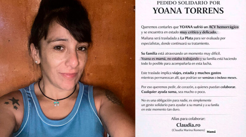 A través de una publicación en redes sociales, familiares y allegados difundieron un pedido solidario para ayudar a Yoana Torrens, quien sufrió un ACV hemorrágico y se encuentra en estado muy crítico y delicado. Según indicaron, la mujer será trasladada a la ciudad de La Plata, donde será evaluada por especialistas y continuará con su tratamiento médico.