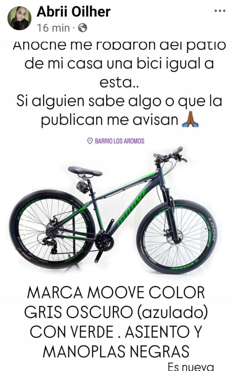 Un vecino denunció en redes sociales el robo de su bicicleta durante la noche, la cual fue sustraída del patio de su vivienda en barrio Los Aromos. Según detalló la víctima en su publicación, el rodado es marca Moove, de color gris oscuro (azulado) con detalles en verde, y cuenta con asiento y manoplas negras.