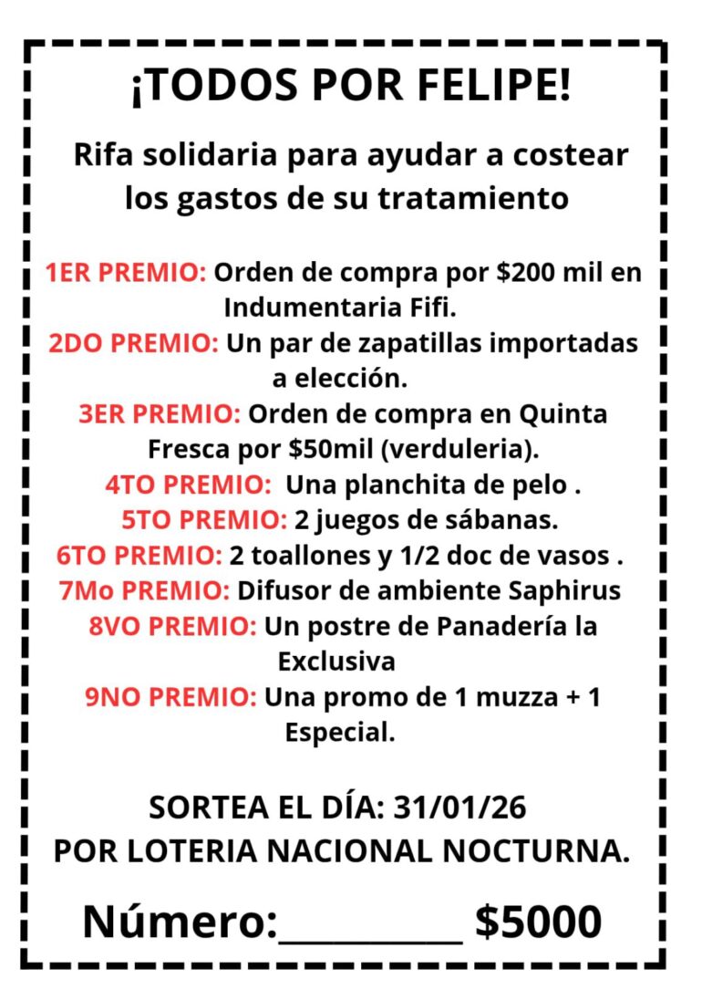 Con el objetivo de reunir fondos para completar el tratamiento, familiares y amigos impulsan una rifa solidaria bajo el lema “¡Todos por Felipe!”. El valor del número es de $5.000 y el sorteo se realizará el 31 de enero de 2026, por Lotería Nacional Nocturna.