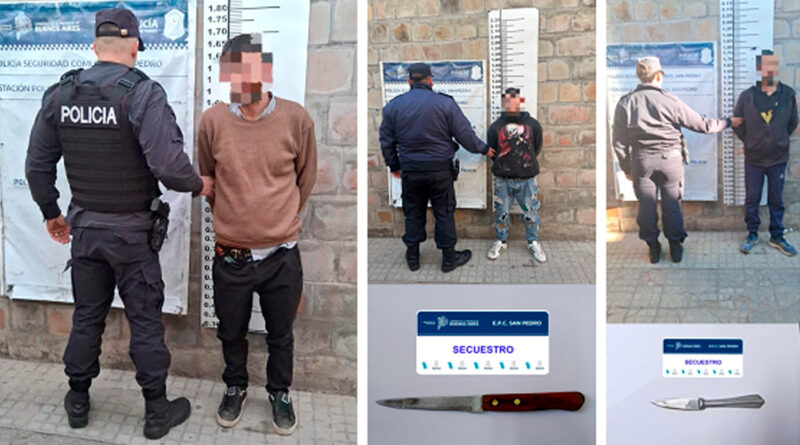 El primer procedimiento se realizó en calle Sargento Selada y Auli, donde fue aprehendido un masculino de 40 años que se encontraba ebrio, alterando el orden público. Más tarde, en Facundo Quiroga y Manuel Iglesias, un joven de 21 años fue aprehendido tras ser encontrado bajo los efectos del alcohol y portando un arma blanca. En el mismo lugar, un hombre de 36 años también fue aprehendido en idénticas circunstancias. Se labraron actuaciones contravencionales con intervención del Juzgado de Paz de San Pedro.