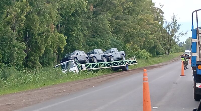 Un camión de gran porte que transportaba vehículos marca Jeep 0 km protagonizó un accidente en la Ruta 1001, a pocos metros del acceso a la ciudad. Por causas que se tratan de establecer, el conductor perdió el control del rodado y terminó saliendo de la calzada, quedando parcialmente dentro de un zanjón lateral.