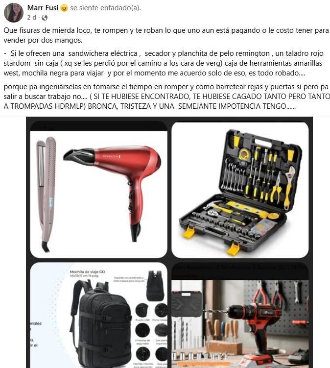 En el mismo mensaje, la vecina manifestó su enojo, tristeza e impotencia por lo sucedido, remarcando el esfuerzo que le implicó adquirir dichos bienes. Asimismo, advirtió a la comunidad sobre la posible venta de estos objetos en el mercado informal.